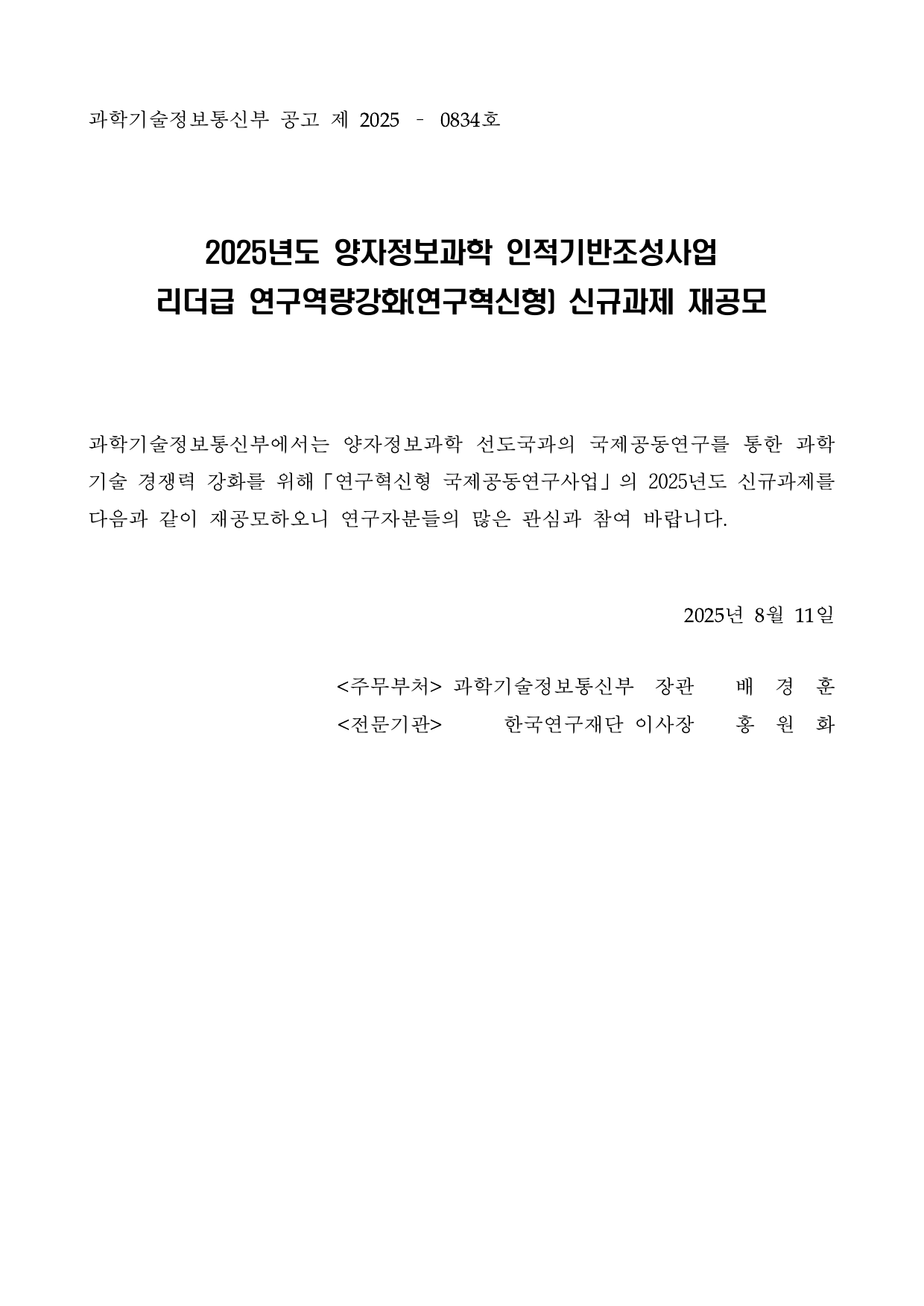 PDF문서2025년도 양자정보과학 인적기반조성사업 리더급연구역량강화(연구혁신형) 신규과제 재공고.pdf